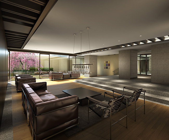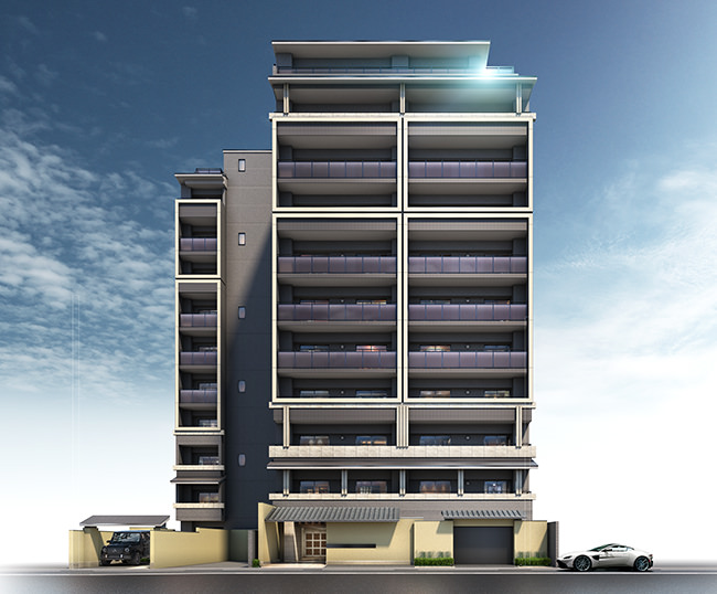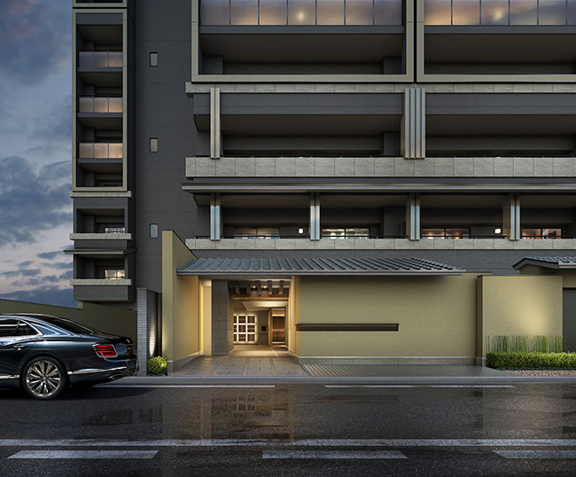 京の雅と都市の洗練を受け継ぐ佇まい 「東三条殿」跡地であり、いまも地下鉄「烏丸御池」駅徒歩5分という京の中枢。賑わいの御池通から一歩奥まった静穏の地に、のびやかな全邸角住戸11階建レジデンスとして誕生する「グラン リソシエ 烏丸御池」。シンメトリックな意匠に品格を纏うクラシックモダンなファサード。マリオンや袖壁、スラブラインで際立たせたグリッドデザインが、基壇部の瓦屋根とともに、街並みに凛然とした表情を描きます。
