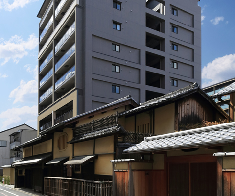 多様に織りなす、京の風雅を愉しむ秀邸 華やかな賑わいを見せる「四条通」を身近にしながら古き良き街並みの風情を感じることができる地に誕生する「グラン リソシエ 京都四条」。快適な利便性と豊かな情緒が共存するこの街が新たな暮らしの舞台。外観には上質さに包まれる質感豊かなタイルを中心に厳選された各種素材を採用し、京の風雅を愉しむ暮らしに相応しい意匠としています。